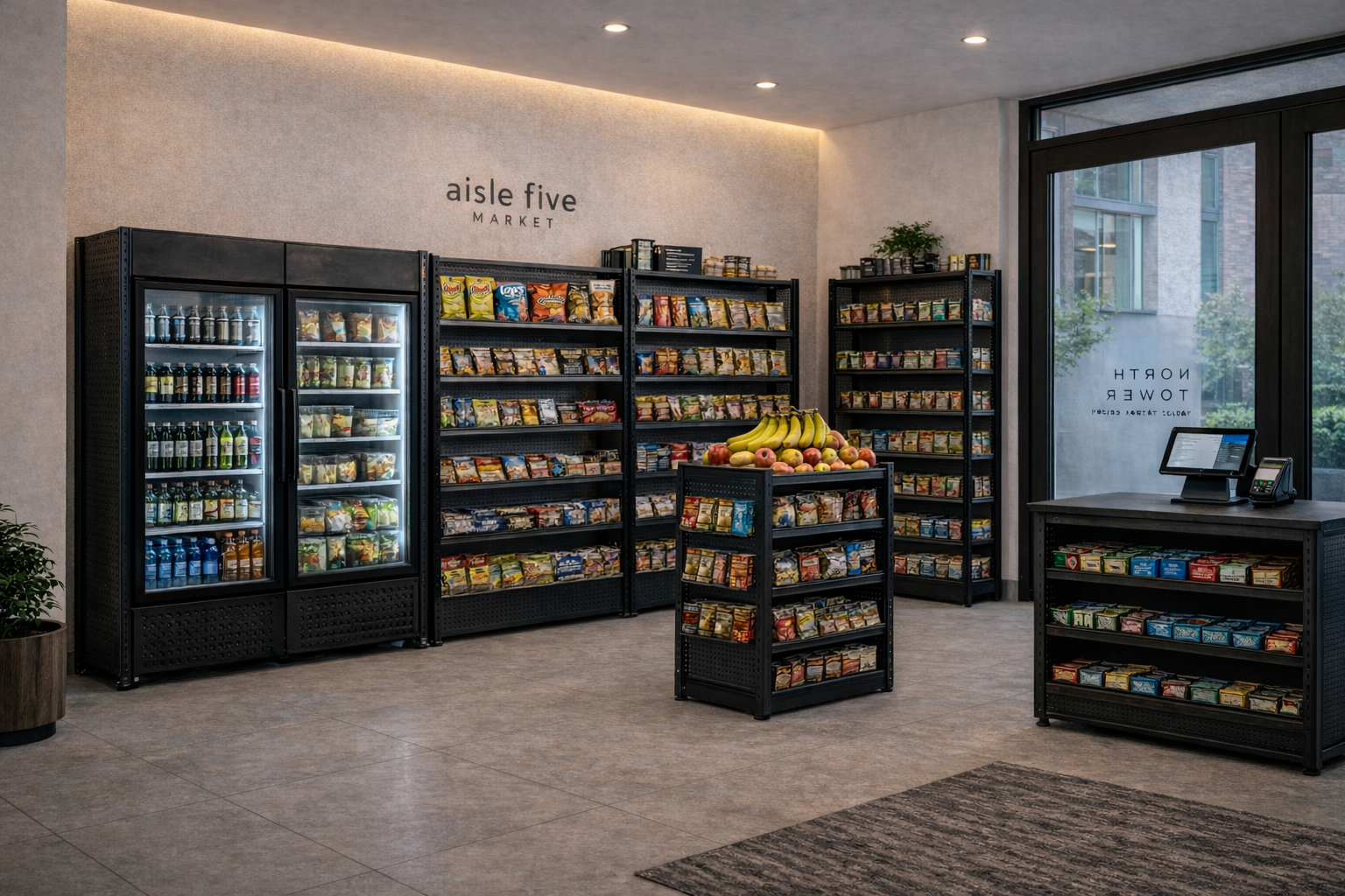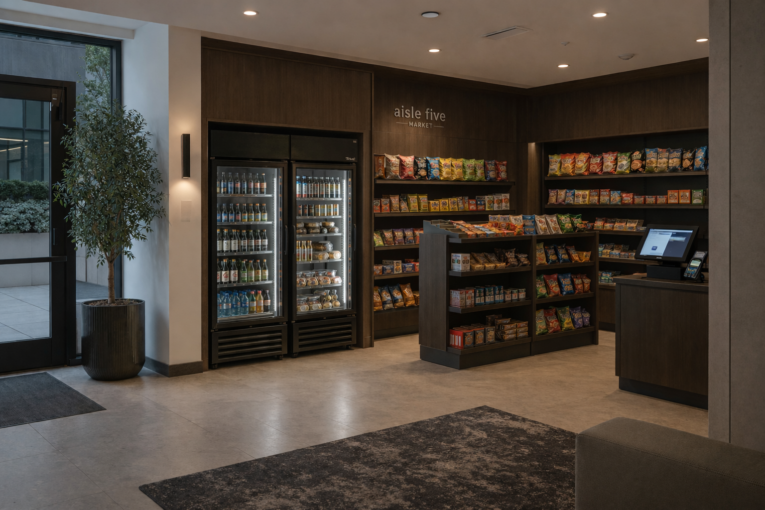 Aisle Five installs and manages 24/7 convenience stores within residential communities.