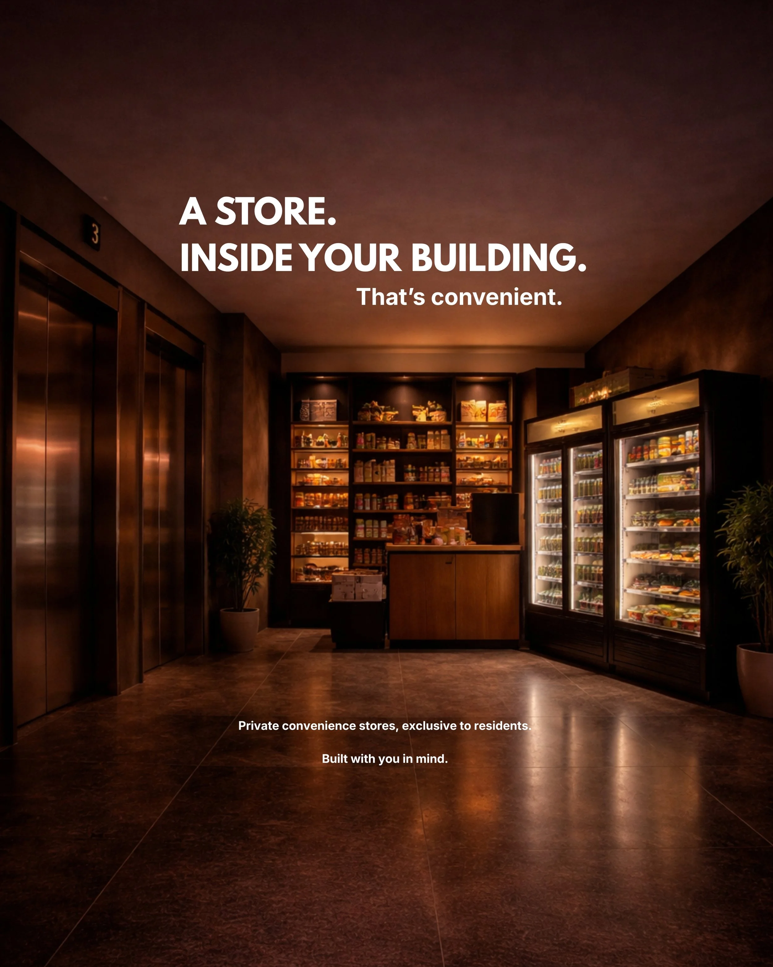 a store in your building - open 24/7 - stocked with: snacks ~ toiletries ~ beverages ~ wellness products ~ household essentials ~ electronics, stationery, & more! -